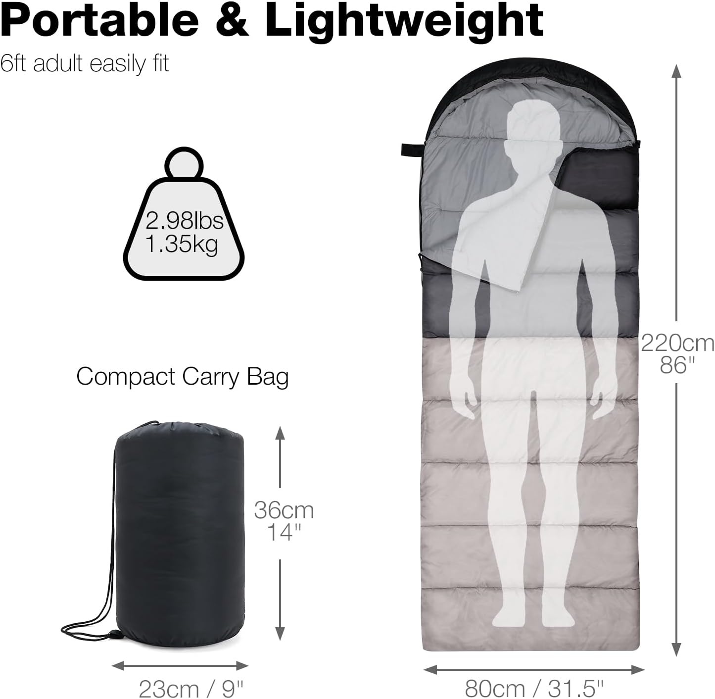 • 【Sleeping Bags for Adults Warm Weather】The sleeping bags rated temperature from 41℉- 68℉(5℃-20℃), which stays warm even at 40℉. Envelope-shape sleeping bag measures 31.5 x 86.6 inches (W x D), and comfortably fits most campers up to 5 feet 11 inches tall.